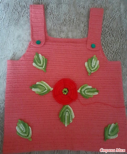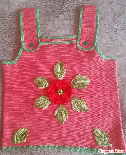 Показываю свою много страдальную маечку для внучки.Вязала и спицами по кругу и поворотными рядами..Потом крючком и не раз распускала и собиралась совсем бросить.Но...связала и показываю вам.