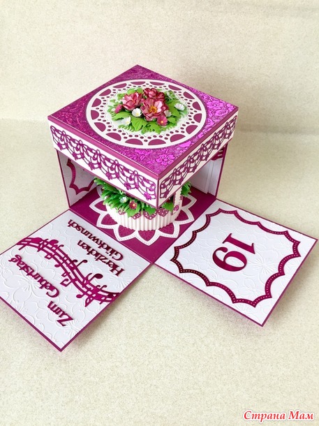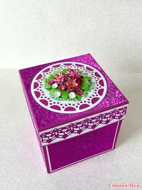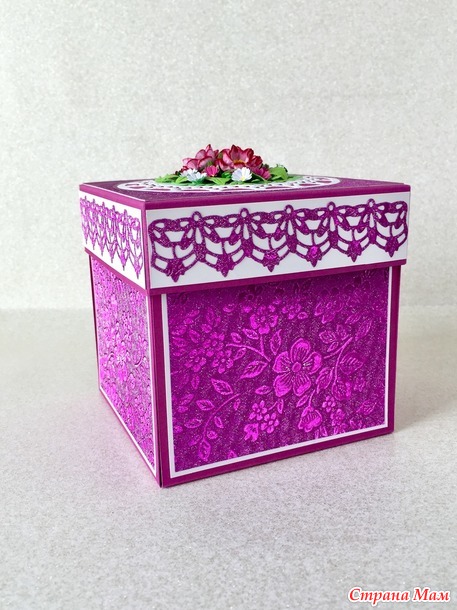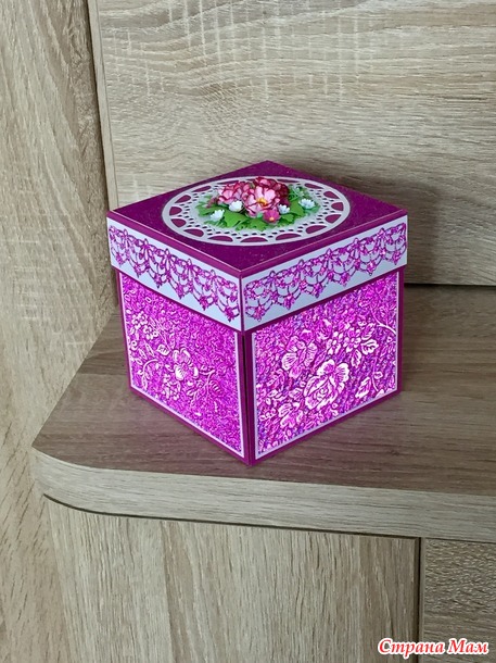 Эту коробочку я дарила внучке в прошлом году. Размер 10 х 10 см. Бумага очень красивая, при искусственном освещении - переливается. Если хотите рассмотреть поближе, откройте фотографию в полный размер и увеличьте.
