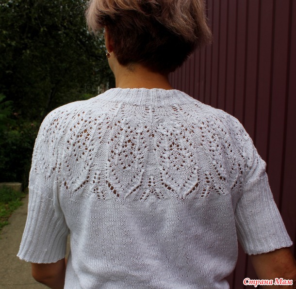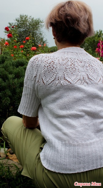 Джемпер на круглой кокетке, ажурный мотив, тушка лицевой гладью; ворот, низ и рукава - резинка 2х2.