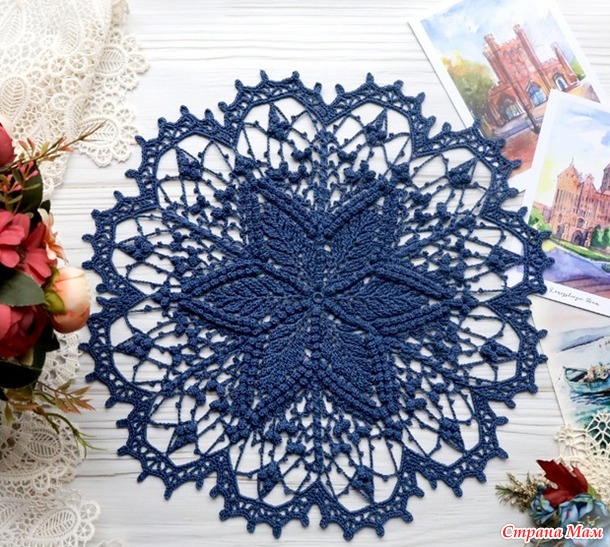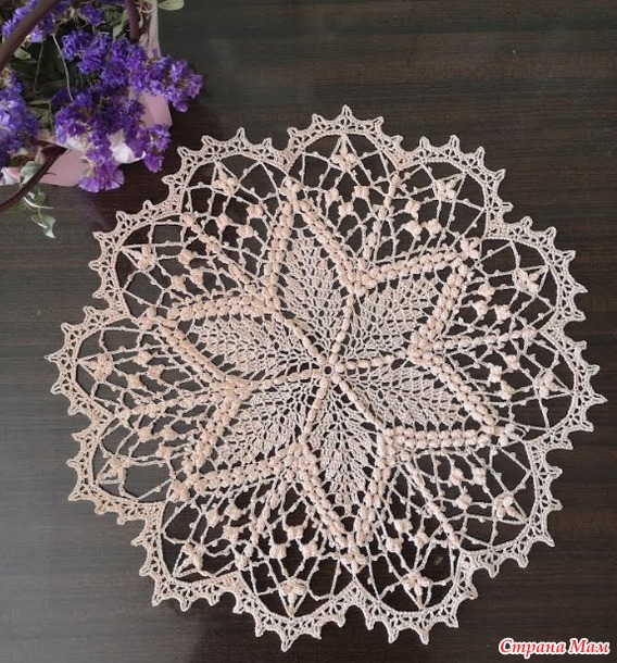 Увидела в ВК эту салфеточку и решила связать, хоть и не люблю я вязать когда много "пико", но ...вот захотелось. Помучилась со схемой немного, кое-где с лупой рассматривала, но все таки связала. Нитки - Янарт Виолет, 282м/50 гр, крючок 1,5, диаметр 45 см. У меня был моток ниток этого цвета и не хватило мотка на последние 2 ряда, хорошо нашла еще чуть-чуть ниток. Думаю что если вязать крючком меньшего диаметра, то одного мотка может и хватить.