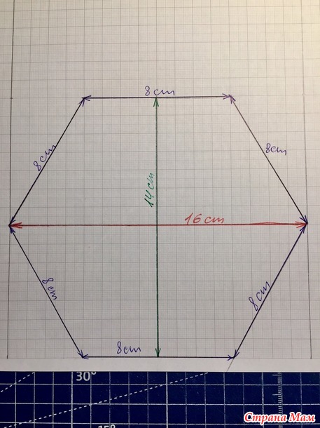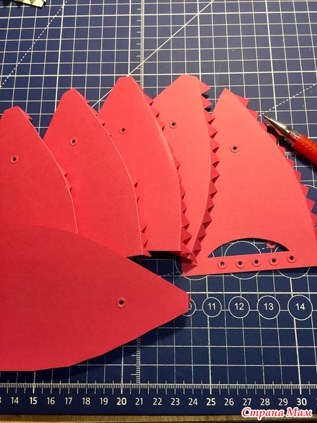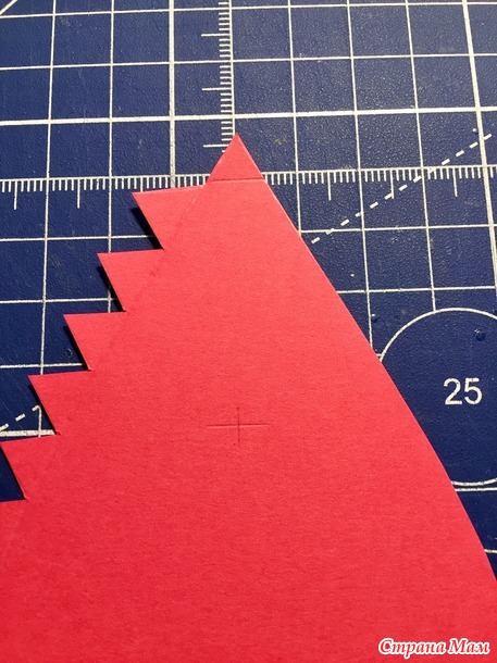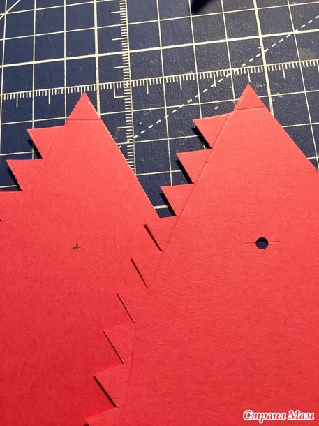 Чтобы у вас дырки были на одном расстоянии, я положила клин на коврик острием на линию и снизу 8 см. делим пополам, сделала метку вертикальную, затем положила линейку горизонтально от верха 4,5 см. и так же сделать метку, здесь будет дырка.