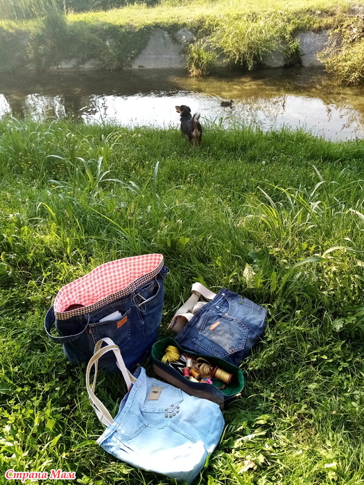 Большая корзина : диаметр дна 36 см, высота 39 см, длина ручек 35 см. Ручки из пояса джинс.