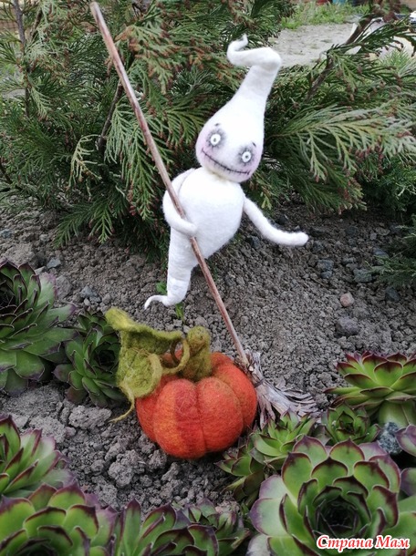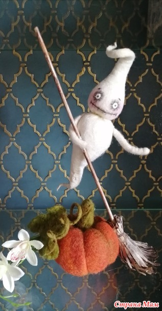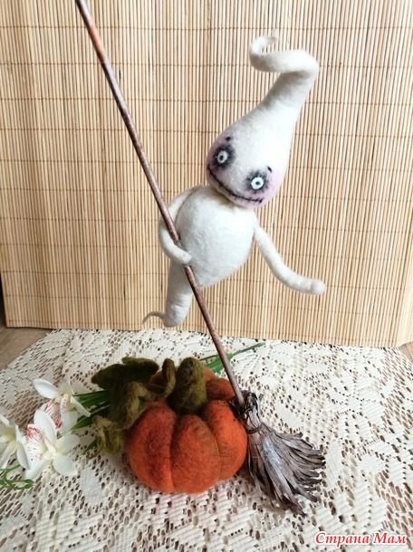 Привидение и тыковка из шерсти, валяла мокрым способом. Метла из шпажки и крафт бумаги))