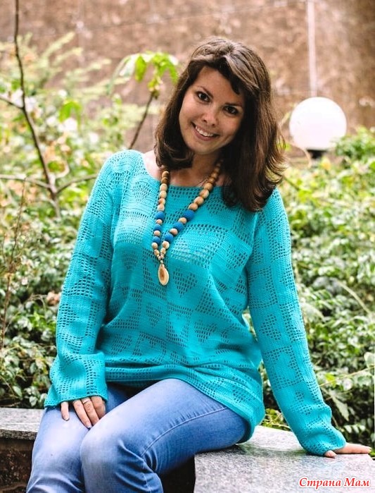 Вам понадобится: бобинная полушерсть (1600 м/100 г, 400 м/100 г) – 350 г бирюзового цвета, крючок № 1,5.
