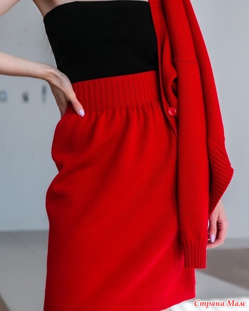 Костюм красный. Связан из итальянского хлопка 1500м в 4 нити на машине Бразер 5 кл. Юбка зауженая к низу, пояс присобран на широкую резинку 2*2. Укороченый карди прямого силуэта со спущеным плечом.