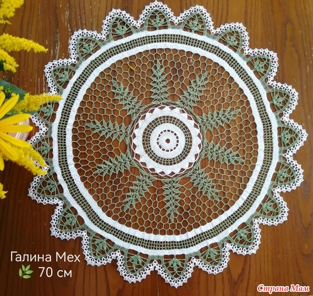У меня небольшой перерыв в вязании и я развлекаюсь салфеточками. Эту салфетку я решила связать под елочку к новому году. Елочка у меня маленькая и показалось что на схеме тоже елочки. Правда к концу вязания я не была уже так уверена в елочках, но довязала до конца. Перед фотографированием решила отгладить салфетку и она почему-то начала фалдить немного...странно...она накрахмалена, была на блокировке...вроде все ровно лежало. Решила разобраться попозже. Хотя на фото оригинала я обратила внимание что тоже фалдить мелкими волнами. Сейчас я бы уменьшила количество фестонов и столбиков с накидом на обвязке сетки. Но это в следующий раз. Нитки Янарт Виолет, 282м/50гр, крючок взяла поменьше, 1,2, думала и диаметр меньше станет, но выиграла совсем немного сантиметров. У меня получился диаметр 68см ( в оригинале 70).
