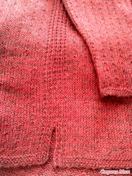 Начала, как обычно, спинку и перед по отдельности, потом объединила и вязала вкруговую до проймы. Вот так выглядят бока: