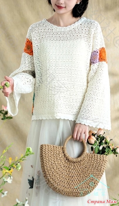 Стильный джемпер с асимметричными вставками из разноцветных мотивов.