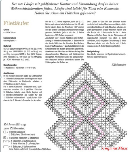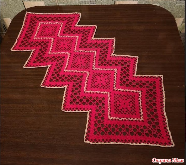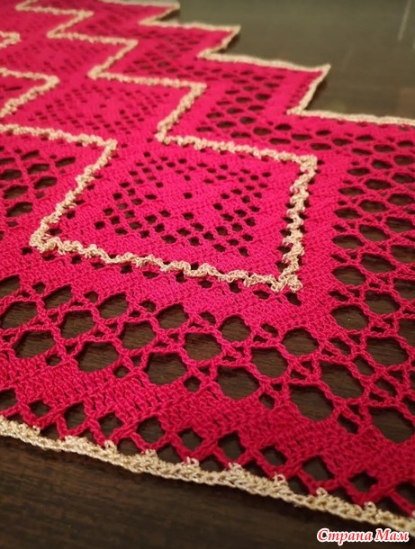 Эту дорожку я увидела в журнале "Dekoratives Hakeln №174 2023" и решила связать. Она меня привлекла отделкой. Сама по себе салфетка простая в исполнении, но я вспомнила что у меня завалялся остаток золотистой тонкой нити и ...взялась за работу. Нитки Ярнарт виолет, 282м/50гр, на отделку не помню уже название, крючок 1,2, длина получилась 93см, ширина 39.