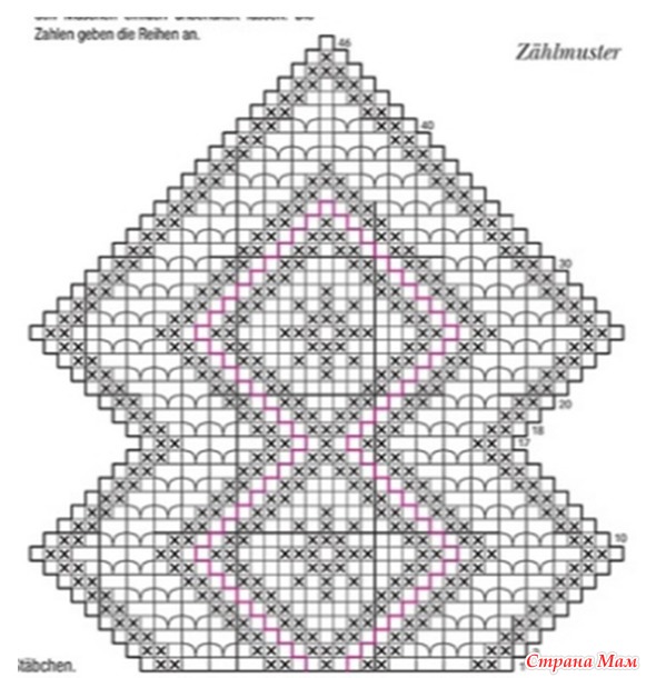 1 ряд - обвязка края 3 воздушные петли + столбик без накида в уголок края. Над острыми краями - 4 возд. петли.