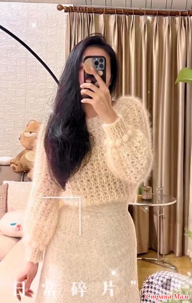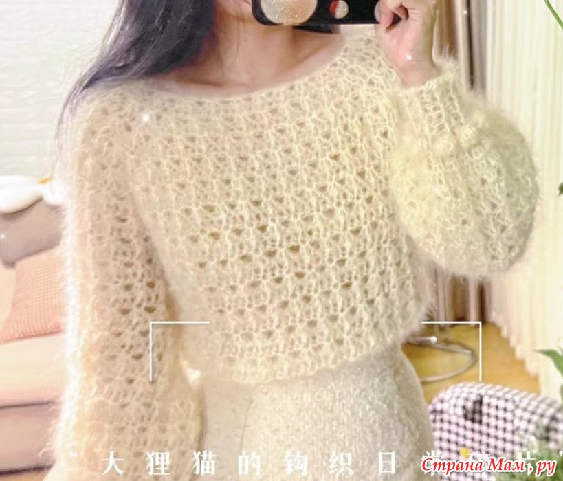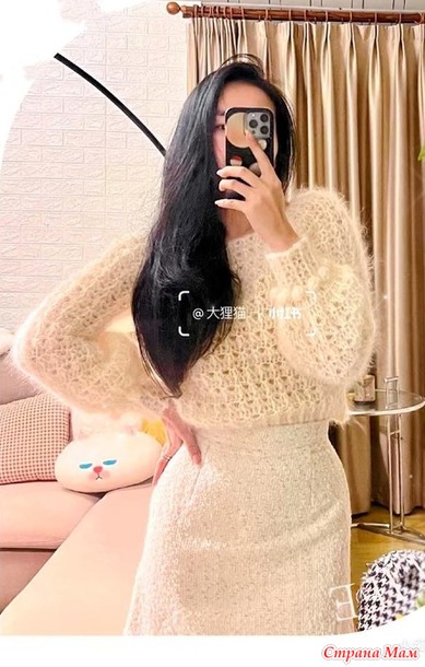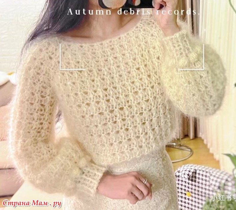 Джемпер вяжется регланом сверху очень симпатичным ажурным узором а пышные рукава на высокой резинке украшает узор объемные шишечки