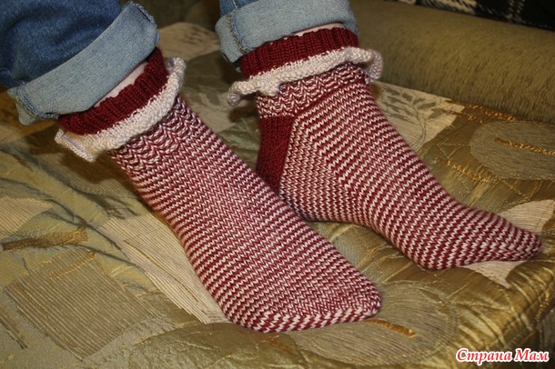 Очень люблю вязание по спирали, т.н. хеликс; особенно выручает, когда на пару носков одного мотка не хватает, а из двух разноцветных - в самый раз. Просто чередовать полоски уже поднадоело, а хеликс со снятыми перекрещенными петлями еще не научилась; вот попыталась разнообразить носочки рюшами. Читать полностью