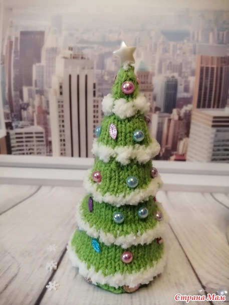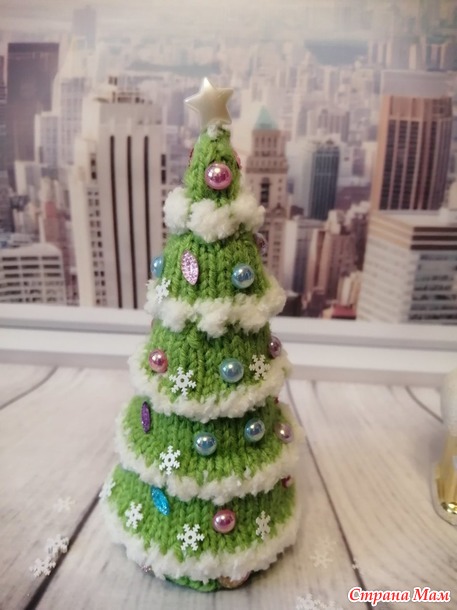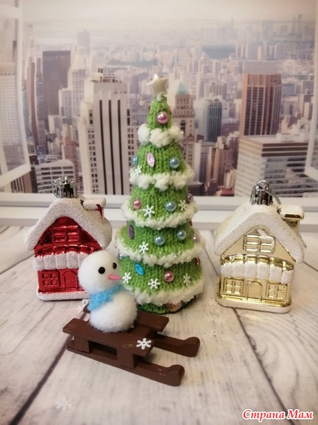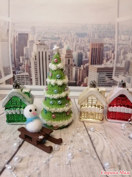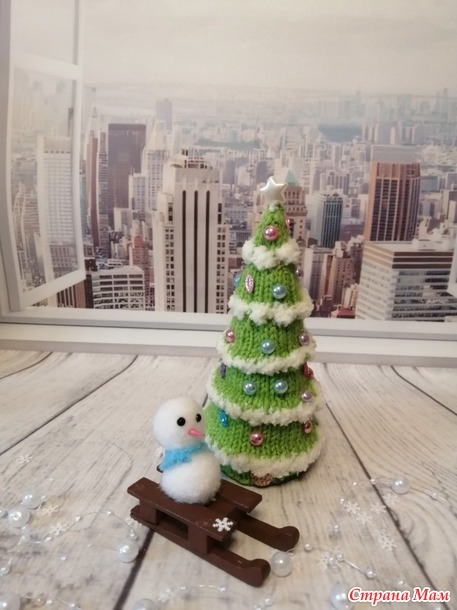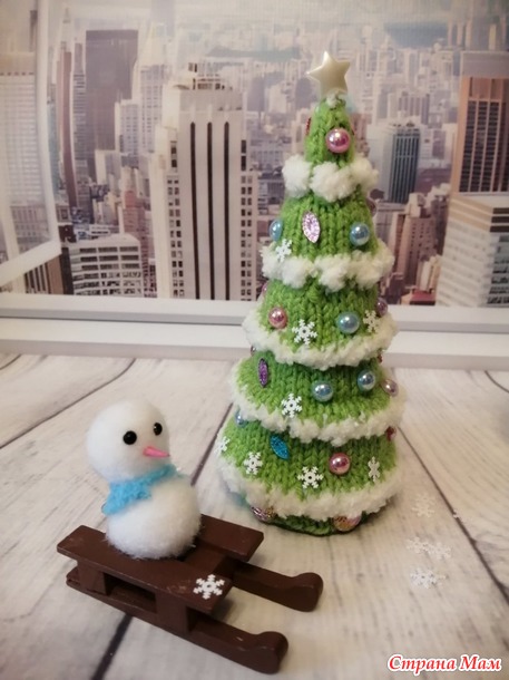 и белая пряжа Софти из старых запасов. Спицы №2. Полубусины и снежики. Высота елочки 12,5см.