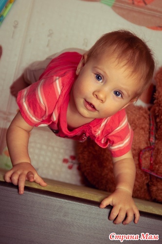 Топает у опоры. Залезает и слезает с кровати на подоконник. Пытается слезть с кровати, пока со страховкой.