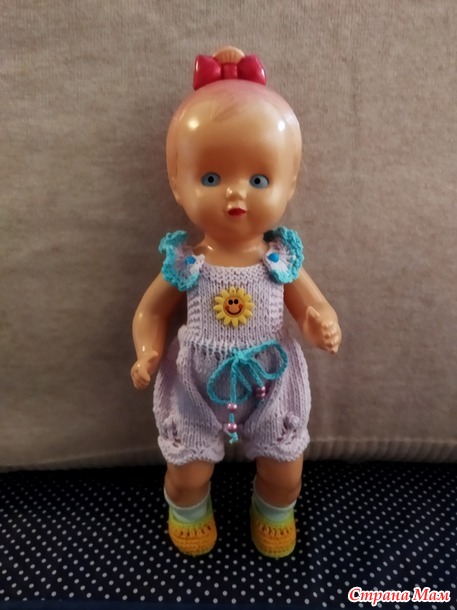 У меня живёт целлулоидная куколка,очень старенькая 50-60х годов,ей тоже связала комбезик и тапочки.