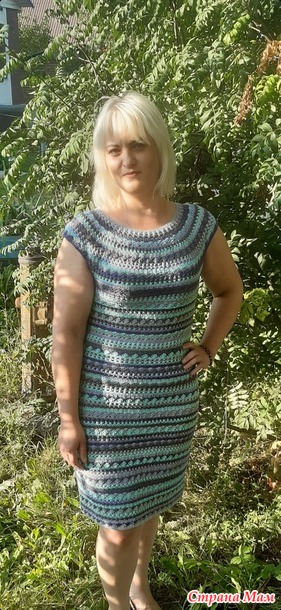 Думаю, платье известно уже всем. Некоторые связали и не одно и в разных вариациях. Моё воплощение такое. Вязала из остатков в основном Газзал Беби Коттон и немного Джинс. Крючок 3. Росток вязала и спереди и сзади иначе не садилось как бы не хотелось. Платье довольно тяжёлое получилось.