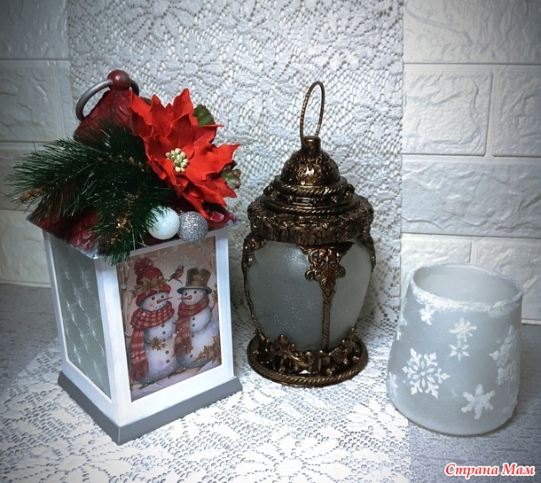 Единственно, здесь покажу из чего они сделаны. Один фонарик из банки,, второй , скорее всего подсвечник, из стакана и третий , это покупной фонарик, где применила технику декупаж и декор.