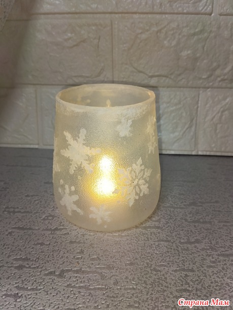 Светильник из стакана. Тут все просто, нанесла гель-пасту прозрачную и через трафарет, ей же снежинки.