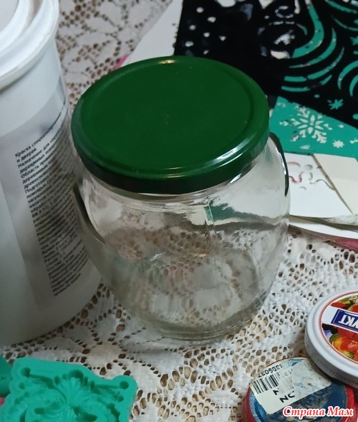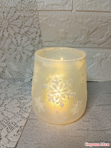 Светильник из стакана. Тут все просто, нанесла гель-пасту прозрачную и через трафарет, ей же снежинки.