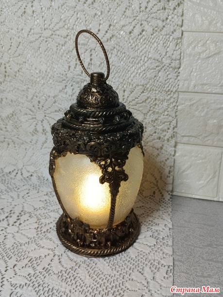 Фонарик - имитация бронзы. Здесь использовала молды, паста-гель, гипс, масса для лепки, картон, салфетки, битумный лак и шеллак лак.