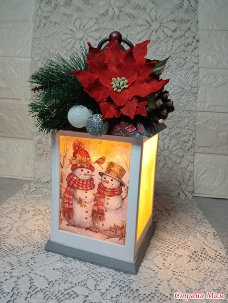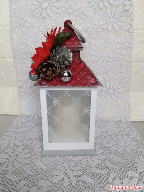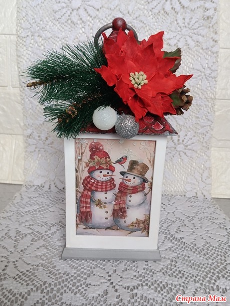 И фонарик, за основу был взят покупной. Здесь я применила декупаж, трафарет,грунт, окрашивание акриловыми красками, паста-гель, фоамиран и разные новогодние мелочи))