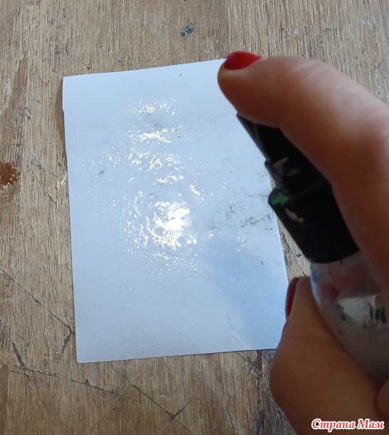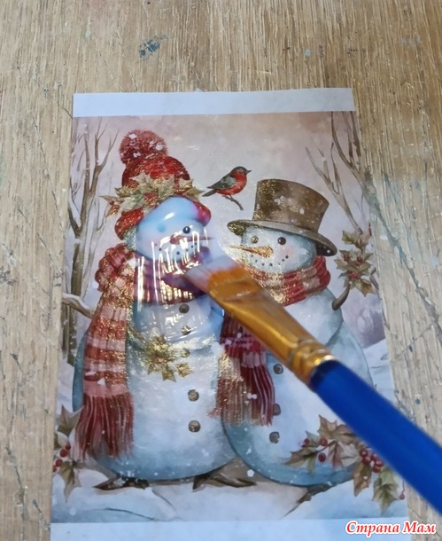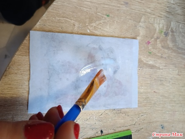 Переворачиваю лицом вверх и аккуратно снимаю верхний файл с картинки. И теперь беру акриловый лак и наношу на распечатку.