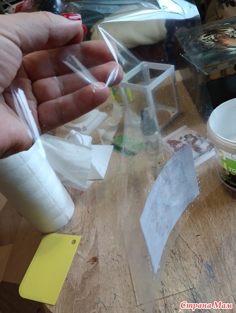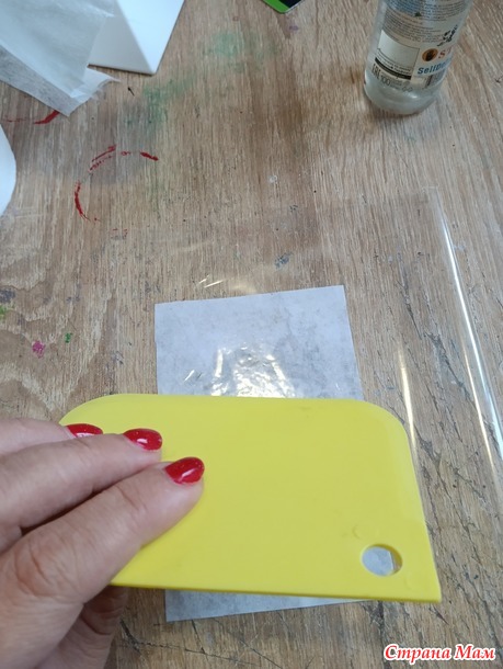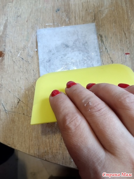 Теперь подхватываю файл на котором лежит картинка и приклеиваю лицом вниз на стекло, использую опять шпатель(банковскую карту ненужную). Им разглаживаю распечатку, выгоняя из-под нее воздух и лишний лак и затем аккуратно снимаю файл.