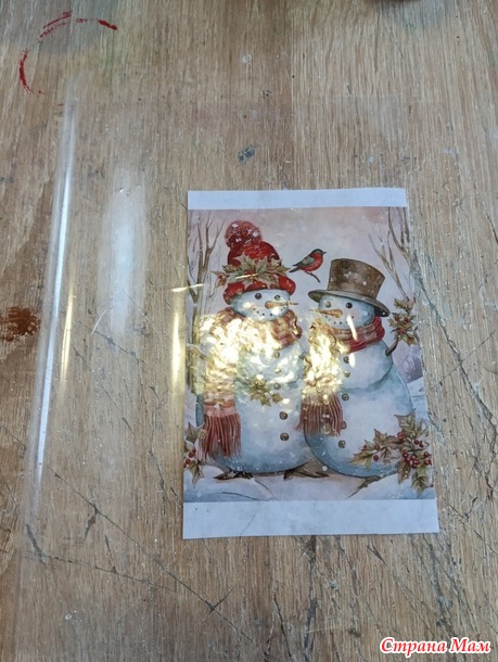 Далее лишнюю воду промокаю сухой салфеткой(тряпочкой). Теперь мне надо перевернуть изображение, декупаж будет обратным т.е. наклеиваться лицом на стекло.