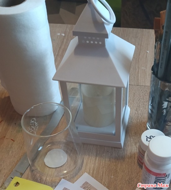 Банку и стакан обезжирила ацетоном, покупной фонарик разобрала, сняла крышу и стекла, которые тоже протерла ацетоном. (Ацетон можно заменить на средство для снятия лака, спирт или хорошо помыть моющим средством или использовать стеклоочиститель)