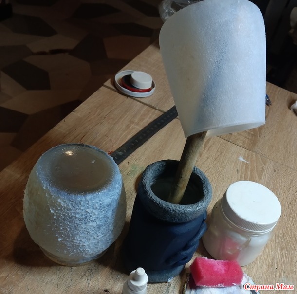 Для начала заматировала всё стеклянное - стакан, банку и два стекла от фонарика. Для этого использовала пасту -гель прозрачную, при помощи губки, тампонирующими движениями, по русски говоря, почпокала губкой