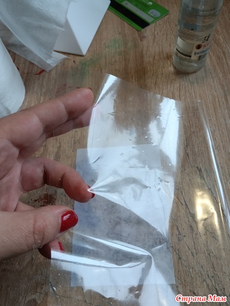 Далее истонченную распечатку положила на файл лицом вниз, распылила воду, можно просто намочить тряпочкой и губкой. Делаю это обильно, так как у бумаги и салфеток при намокании есть свойство растягиваться, помогаю пальчиками распечатке лечь ровно.
