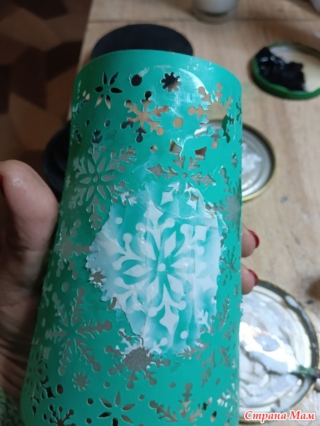Когда снежинки просохли, нанесла на них акриловый лак и посыпала белыми блестками. Всё, первый светильник из стакана готов)) Для рисунков, которые наносятся, через трафарет, можно смело использовать акриловую шпатлевку, что тоже существенно дешевле. Как с ней работать, опишу ниже.
