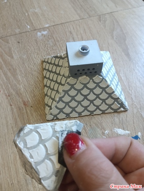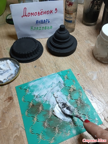 Теперь берусь за крышу. Для начала, я её обезжириваю и грунтую. Это обязательно, на пластике краска всегда держится плохо и без грунта не обойтись)) В качестве грунта использовала краску акриловую в баллончиках. К сожалению она сильно пахнет и делать это лучше вне дома или при открытом окне. А также, можно развести 1:1 акриловый лак и акриловую белую краску, я так делаю для стекла, если честно на пластике не пробовала. Далее, после сушки беру трафарет и акриловую шпатлевку и наношу рисунок шпателем. Вот что получается.
