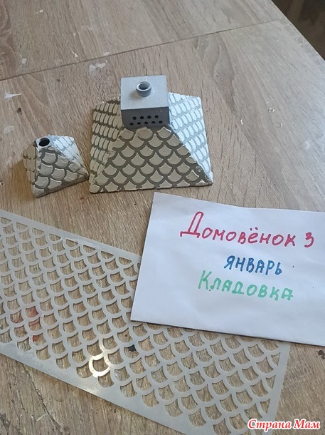 Теперь тонировка, выделяю рельеф и придаю объем так называемой "черепице" . Тут много разных техник можно использовать)) Я развела водой темно - коричневую краску и наложила верхним слоем довольно плотно и сразу же прохожусь стирая этот слой влажной салфеткой, Сверху краска стирается, а в углублениях остается. Так можно делать несколько раз, пока не устроит эффект.