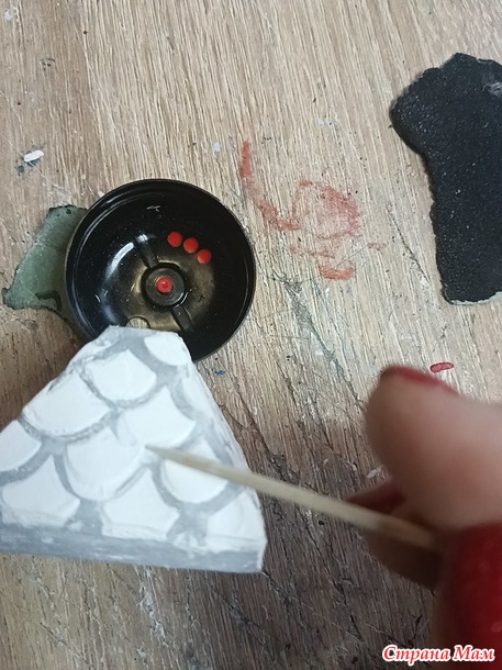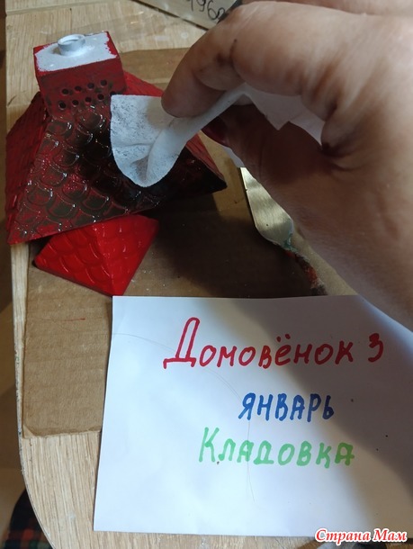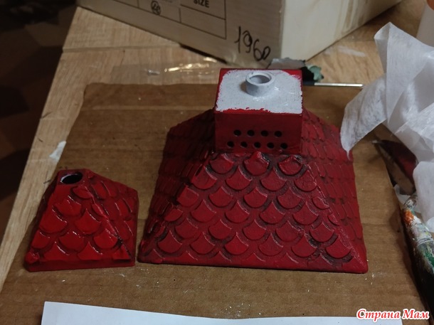 Затем покрасила крышу красной краской в два слоя. На фото видно проплешины, это так высыхает краска на шпатлевке в один слой, по этому как минимум нужно два)) И покрываю тонким слоем акрилового матового лака.