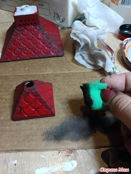 Опять покрываю лаком. и выделяю при помощи сухой губки или кисти ребра крыши. Набираю на губку(кисть) коричневую краску, отбиваю почти до сухого состояния в палитру или на бумагу и потом легкими постукивающими движениями прохожусь по ребрам крыши. Опять лакировка.
