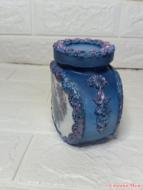 А эта баночка с перламутром. Тут всё просто)) акриловые краски,окрашивание градиент, литое кружево, на крышечке оттиск молда и вживление картинки, тонировка перламутровыми пигментами.