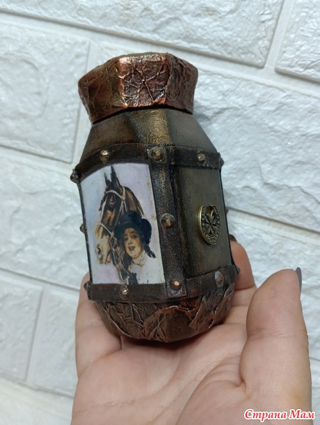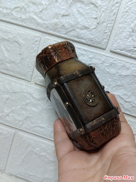 В качестве материалов использовала акриловые краски,битумный лак,сложное окрашивание, мятая крафт бумага, ремни сделаны из фоамирана, клепки из акриловых страз и перекрашены бронзой, вживление картинки.