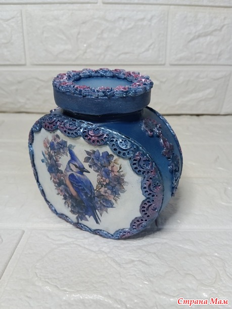 А эта баночка с перламутром. Тут всё просто)) акриловые краски,окрашивание градиент, литое кружево, на крышечке оттиск молда и вживление картинки, тонировка перламутровыми пигментами.