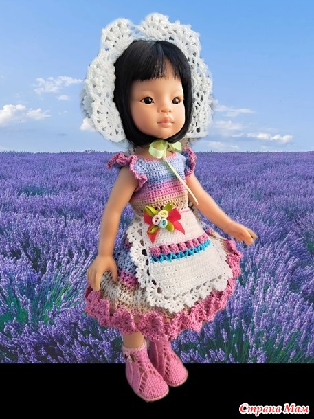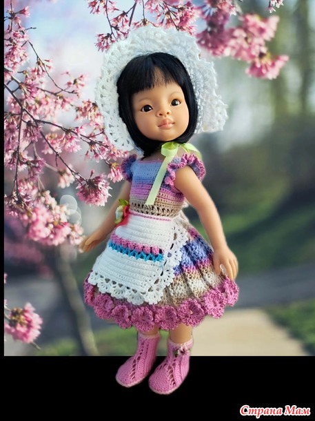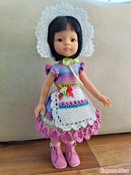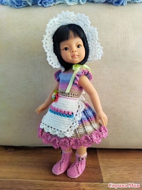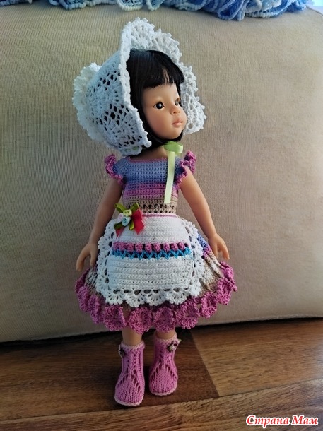 Этот комплект состоит из платья, фартука, чепца и сапожек.