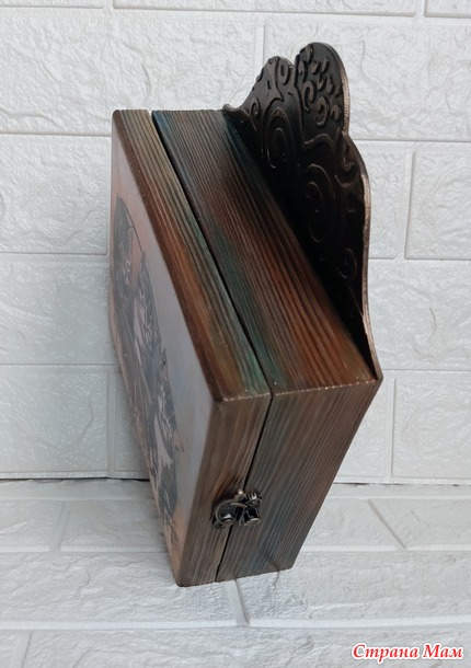 Вот почти и все, прикрутила петли, заказала другие и замочек. Натерла внешние стороны ключницы прозрачным воском, на следующий день отшлифовала шерстяной тряпочкой. На накладке по узору совсем деликатно прошлась бронзовым воском и по углам ключницы так же. Здесь лишнего блеска не нужно, работа сделана все таки в состаренной технике, но небольшие нюансы все таки захотелось подчеркнуть))