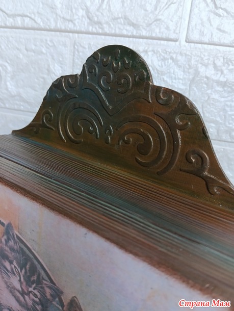 Теперь декор фигурной накладки, наложила шпатлевкой трафарет, после просушки, прошлась шкуркой, сняла небольшие неровности. Потом сделала выкрас и лессировку.
