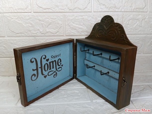 Не понравилось, получалось как то мрачновата, решила перекрасить в голубой цвет, не чистый, добавила в краску немного черного цвета, что бы приглушить излишнюю яркость, в этой работе она была не нужна. Затем нанесла бронзовой краской через трафарет надпись, затонировала рейки и сделала небольшой набрызг на фон коричневой краской и покрыла матовым лаком. Вкрутила крючки, правда они мне показались немного большеватыми для такой ключницы, но других не было))