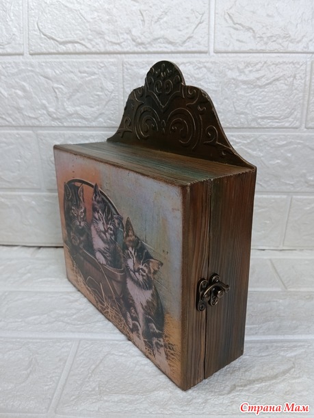 Вот почти и все, прикрутила петли, заказала другие и замочек. Натерла внешние стороны ключницы прозрачным воском, на следующий день отшлифовала шерстяной тряпочкой. На накладке по узору совсем деликатно прошлась бронзовым воском и по углам ключницы так же. Здесь лишнего блеска не нужно, работа сделана все таки в состаренной технике, но небольшие нюансы все таки захотелось подчеркнуть))