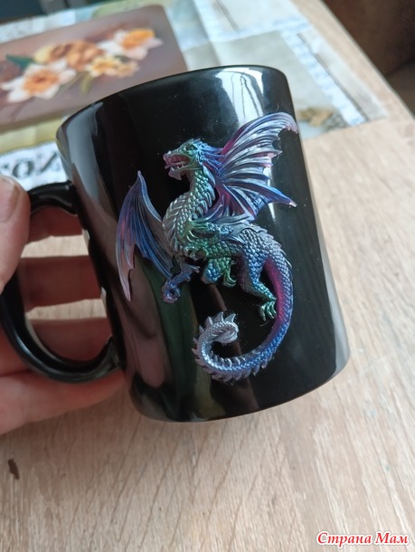 И еще чашка, правда не пасхальная)) Совсем закрутилась и забыла её нормально отснять,улетела в подарок, осталось только такое фото. На кружке дракон, это отливка из эпоксидной смолы с перламутром.
