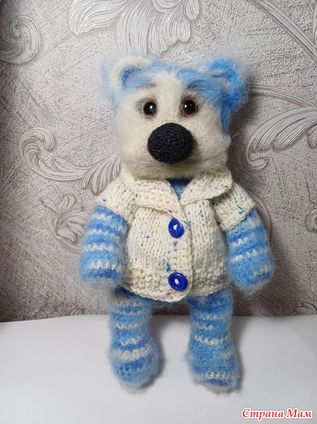 Признаюсь, что я побоялась покупать неизвестную пряжу. По её совету вязала из имеющейся дома пряжи с акрилом. Сначала был медведь Григорий. Потом начала заяца. Он оказался в недовязах...