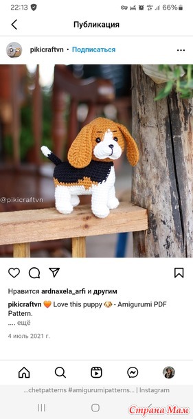 Последний пёсик действительно меня даже удивил. Не ожидала такого восторга от вязания. Просто хотелось попробовать новый способ вязания туловища... Недавно нашла автора в Инсте... Всё игрушки похожи с этой собакой... однотипные, их много. Как уж описание в pdf попало на наши сайты, не знаю. Но подробности автор, оказывается, продаёт за определённую сумму... А сложного , как мне показалось, ничего нет. А результат от другой пряжи ошеломляющий