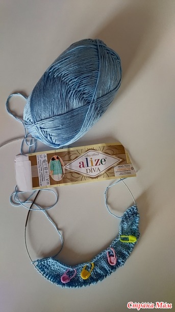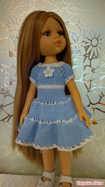 Полочку и юбку (с оборками) платья вязала лицевой гладью пряжей — Alize Diva голубогоцвета,отделка – белого цвета; спицы круговые 2 мм.
