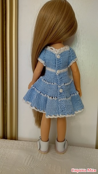 После вязания полочки, провязала 8 рядов ( мерить по кукле) лицевой гладью, затем начала вязать юбку ( состоящую из двух оборок, первые дваряда каждой оборки вязалабелой пряжей).