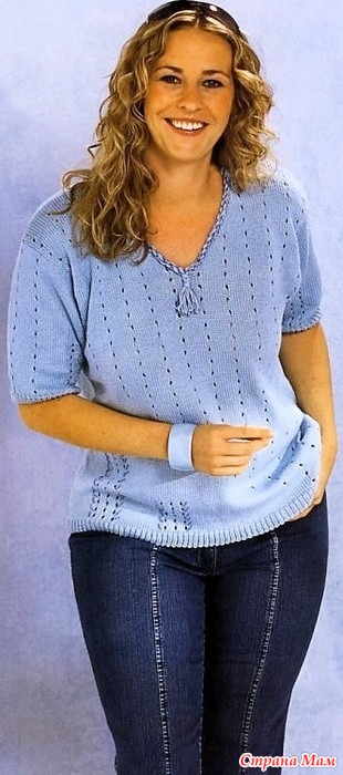 Летний пуловер с ажурными дорожками. Спицы.